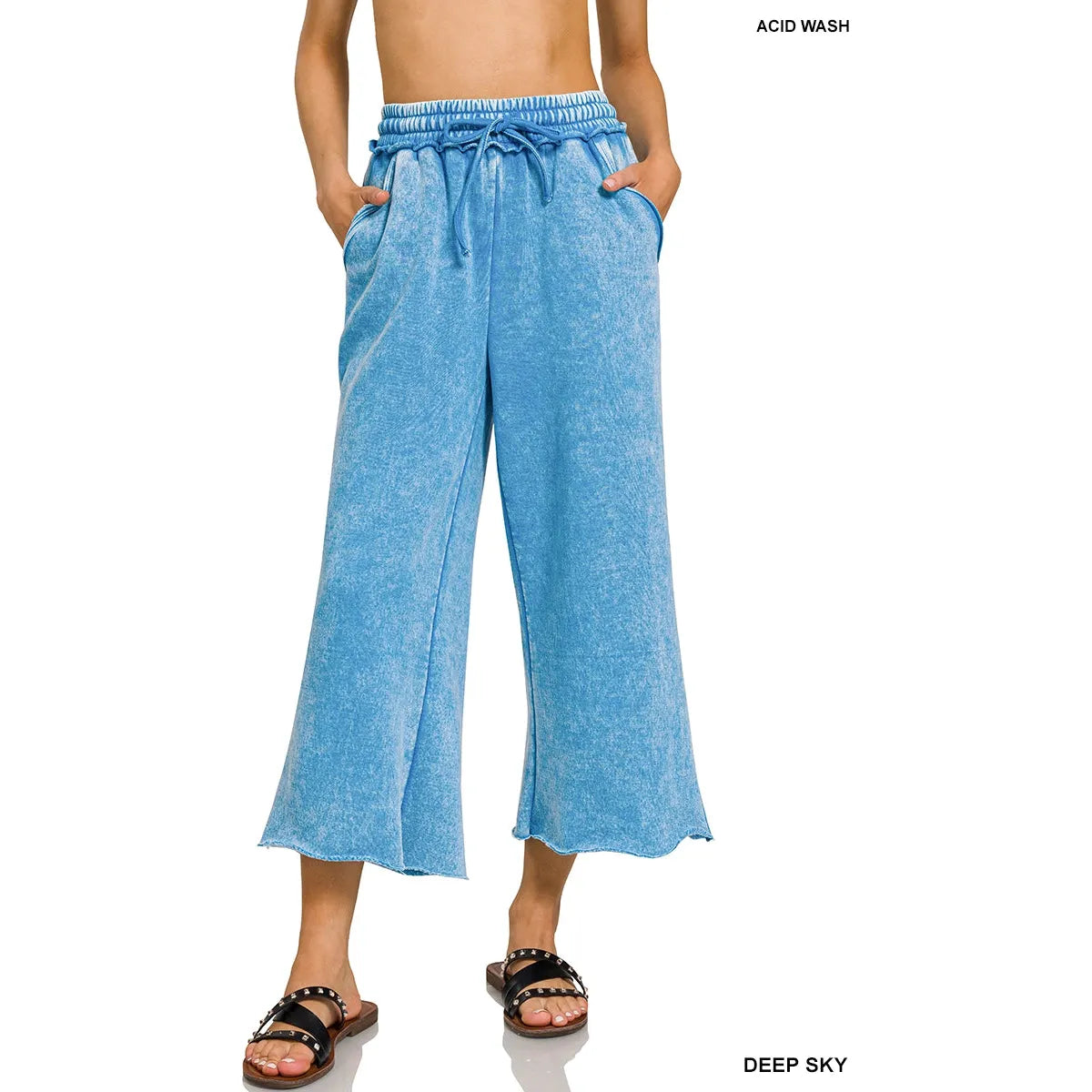 Our Best Selling Acid Wash Fleece Palazzo Sweatpants With Pockets - Drawstring Band Waist - Pockets - Raw Hem.
