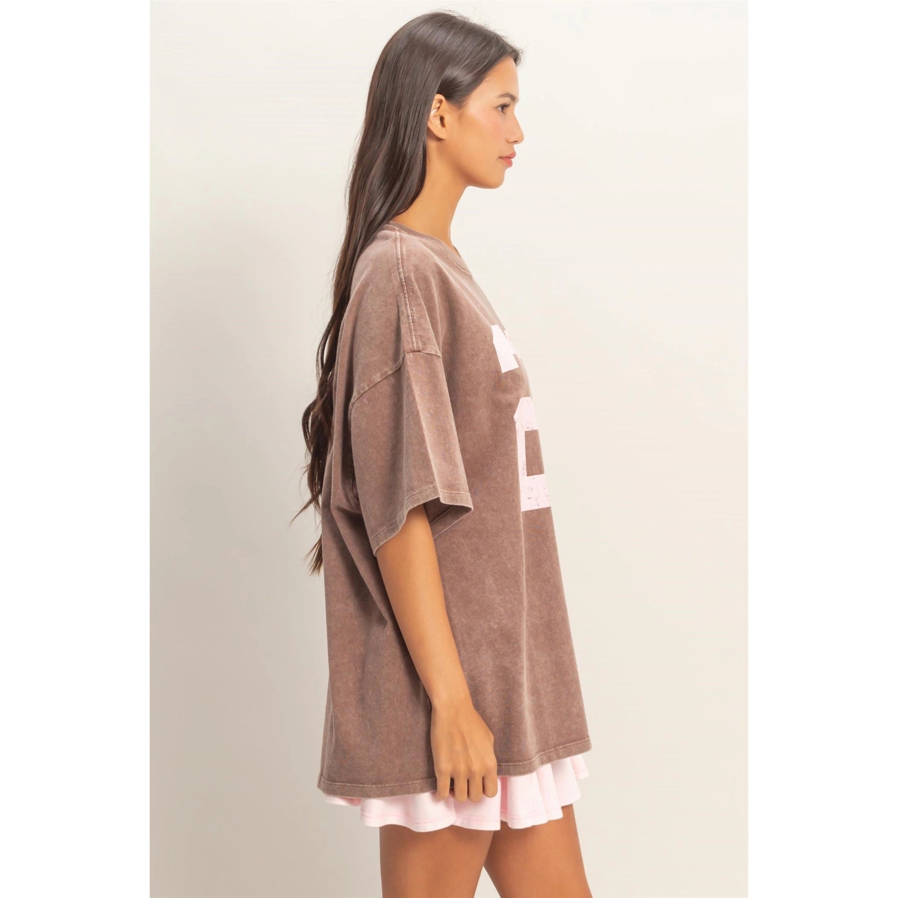 This soft cotton T-shirt features a mineral wash finish and features a classic ribbed crew neckline and comfortable wide drop-shoulder sleeves. A large, distressed number graphic sits prominently across the chest. With an oversized, tunic fit, this top is perfectly paired under a denim jacket or with joggers for a laid-back look.